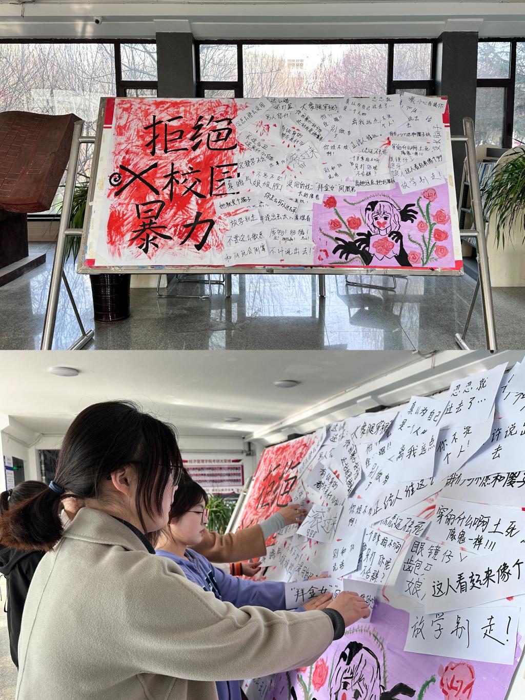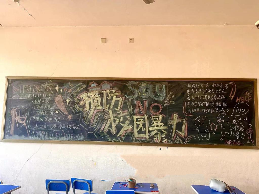 活动分为黑板报、手抄报和展板三个部分。在黑板报布置中,同学们通过图文结合的方式,将校园欺凌的危害、预防校园欺凌的措施以及如何预防应对校园欺凌,生动地呈现在板报上。各班级精心策划,细心准备,用彩色粉笔勾勒出排版美观,主题鲜明的黑板报。手抄报采用征集的方式,同学们踊跃参加活动,运用丰富的色彩和独特的笔触完成了手抄报的绘制。手抄报紧紧围绕“反对校园欺凌”的主题,表达同学们勇于反抗的决心和勇气。在绘画展板环节中,辅导员老师和同学们从展板背景、字体设计、图画颜色等方面进行了认真和精心制作,体现了独特的匠心和创意。然后,老师和同学们一起将展现语言霸凌的标签贴在展板上,用以激励员工们面对语言霸凌“亮剑”的勇气以及向校园欺凌说“不”的决心。