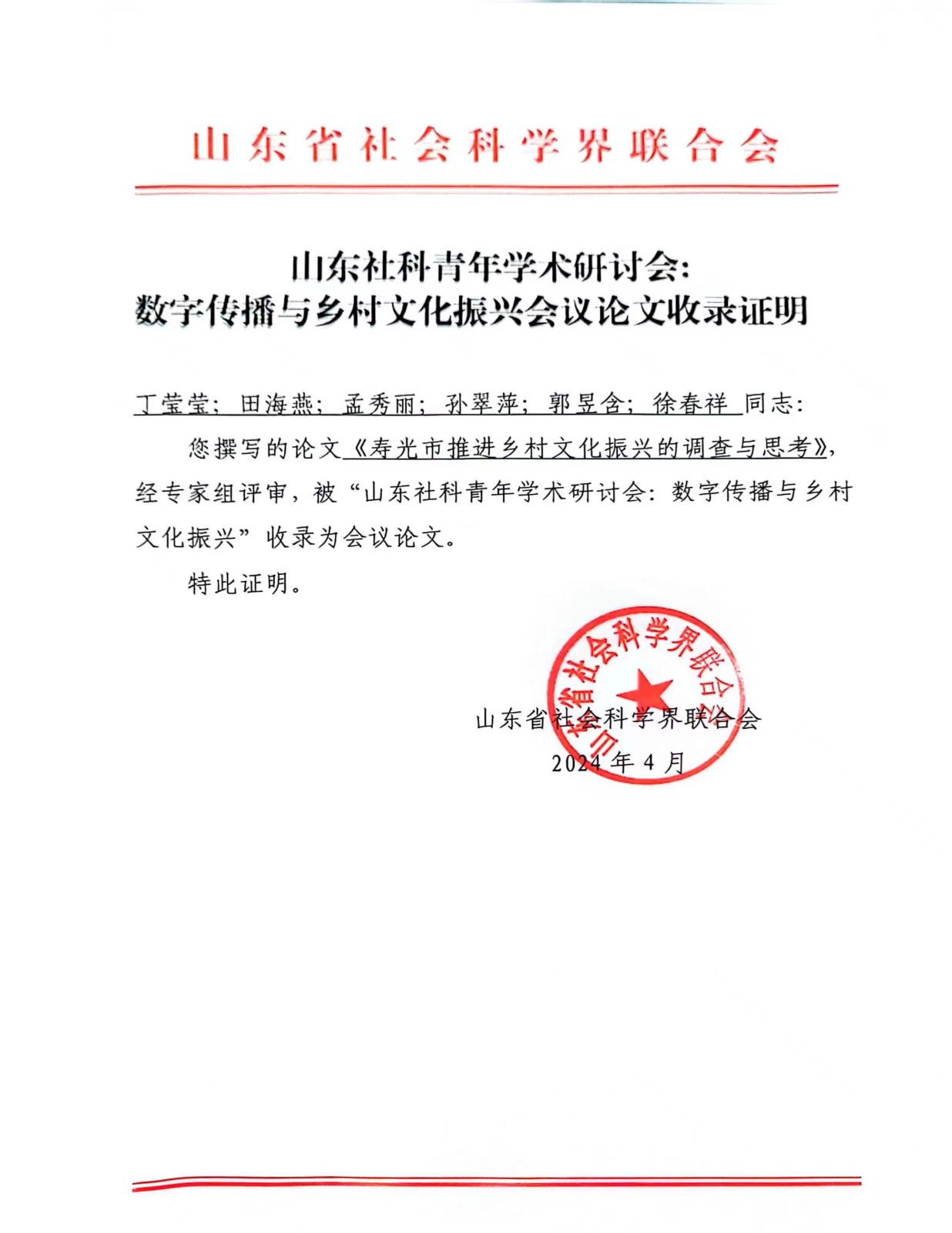 县域乡村文化振兴发展。从调研情况看,寿光市县乡村三级立足自然条近日,《山东社科青年学术研讨会:数字传播与乡村文化振兴》在菏泽学院召开,研讨会上,山东省社科联公布了本次学术研讨会优秀论文收录情况,据悉,本次研讨会面向全国高校和社会征集论文200余篇,经专家评审、社科联评议等环节,最终收录20余篇。由乡村振兴研究院副经理丁莹莹牵头完成的《寿光市推进乡村文化振兴的调查与思考》调研成果成功入选。