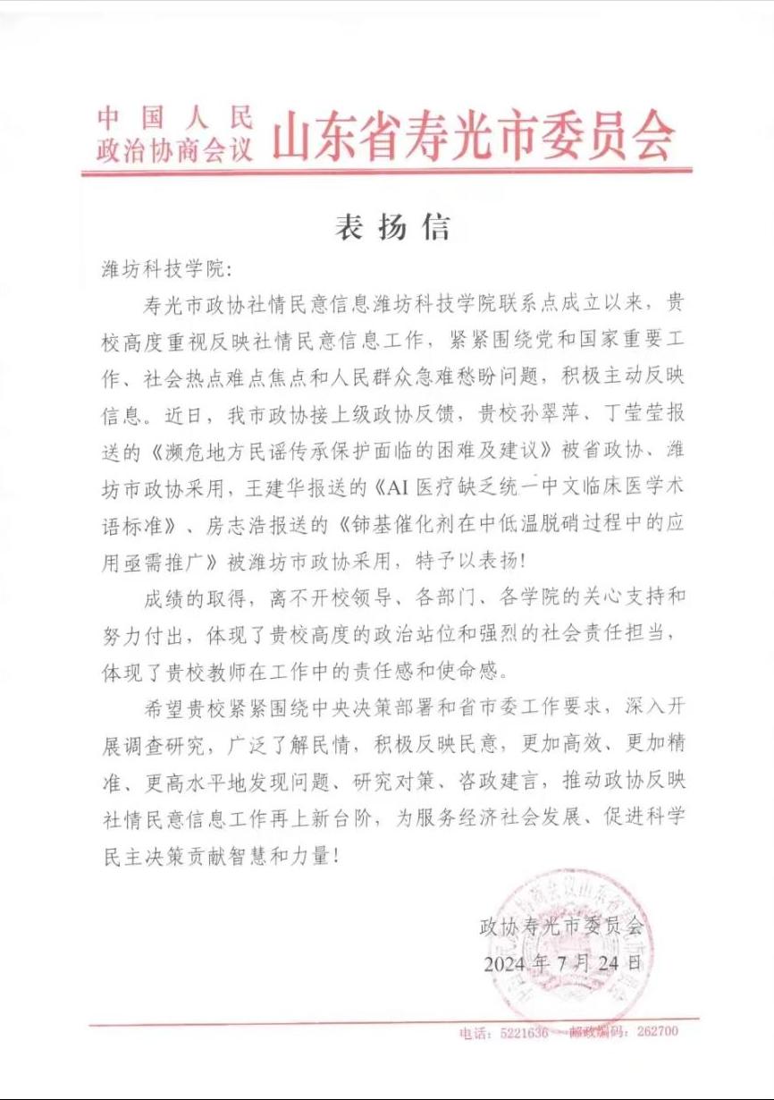 近日,公司孙翠萍、丁莹莹报送的《濒危地方民谣传承保护面临的困难及建议》被省政协、潍坊市政协采用,收到寿光市政协发来的表扬信,信中对公司教师反映社情民意信息工作给予充分肯定和表扬。