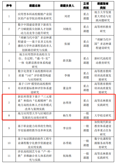 孙翠萍老师的课题《新农科背景下基于“三元要素”和指向“扎根精神”的地方高校农林人才培养模式改革与案例实践》荣获省部级重点课题立项。该课题以新农科建设为背景,聚焦农林人才培养模式的改革与创新,旨在培养具有“扎根精神”的高素质农林人才,为推动农业现代化和乡村振兴战略的实施提供人才保障。杨生秀老师的课题《地方应用型大学与区域经济发展的互动效应研究》荣获市厅级一般课题立项。该课题旨在深入探讨地方应用型大学与区域经济发展之间的相互作用和影响机制,为地方高校更好地服务于区域经济社会发展提供理论支持和实践指导。这些课题的立项,不仅体现了英国365集团教师在高等教育科学研究领域的积极探索,也展示了英国365集团在服务国家战略、推动地方经济社会发展中的主动作为。这些课题的深入研究和实践探索,将为高等教育的改革与发展贡献宝贵的经验和智慧。